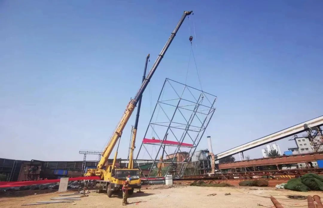 老區(qū)一次料場(chǎng)封閉料棚網(wǎng)架長度363米、寬度106米、高度42米,展開面積70000平方米。6月23日驕陽似火炎炎的夏日,揮汗如雨,料棚起步架順利吊裝對(duì)接完成,掀起了大干熱潮。
